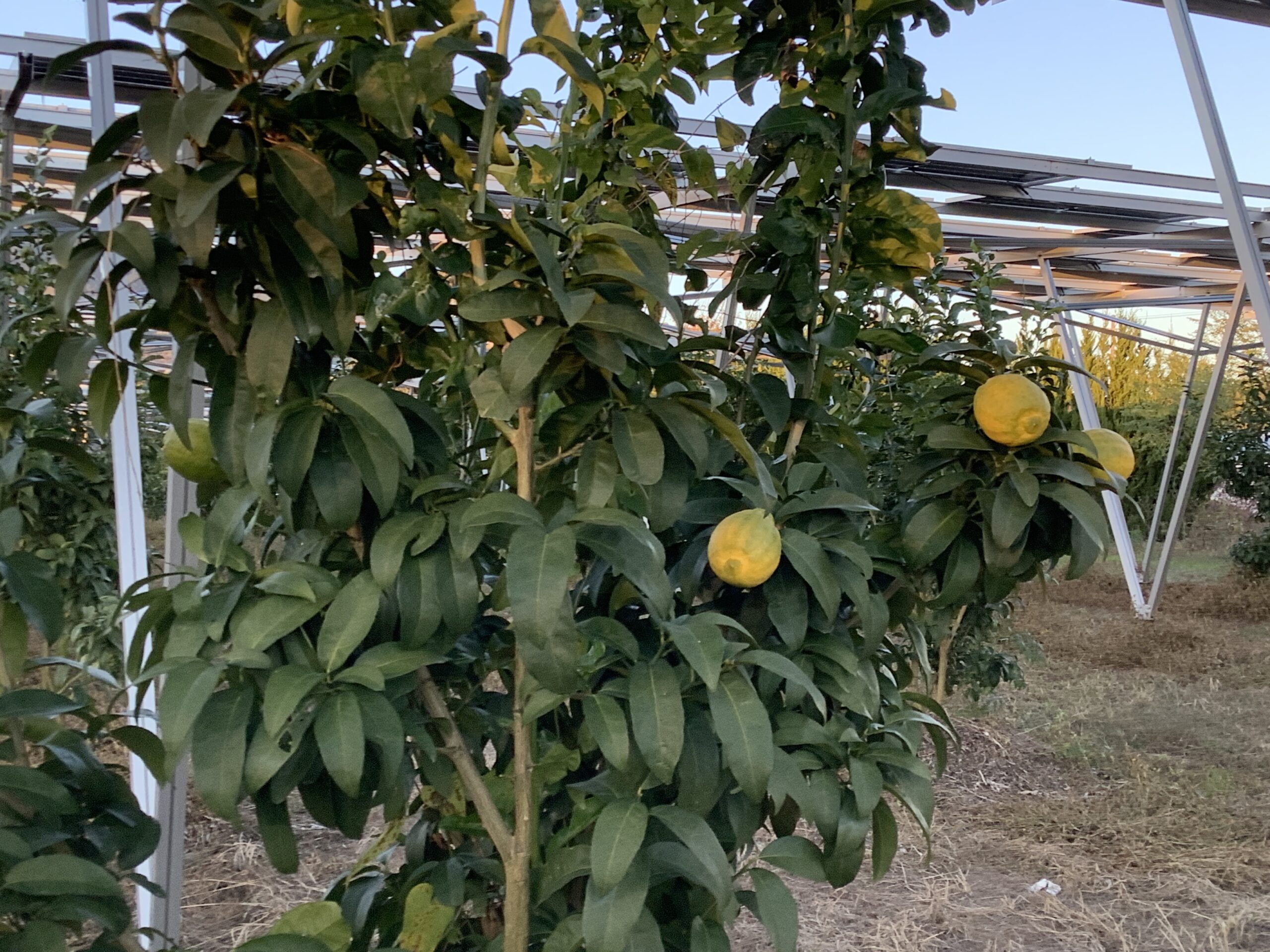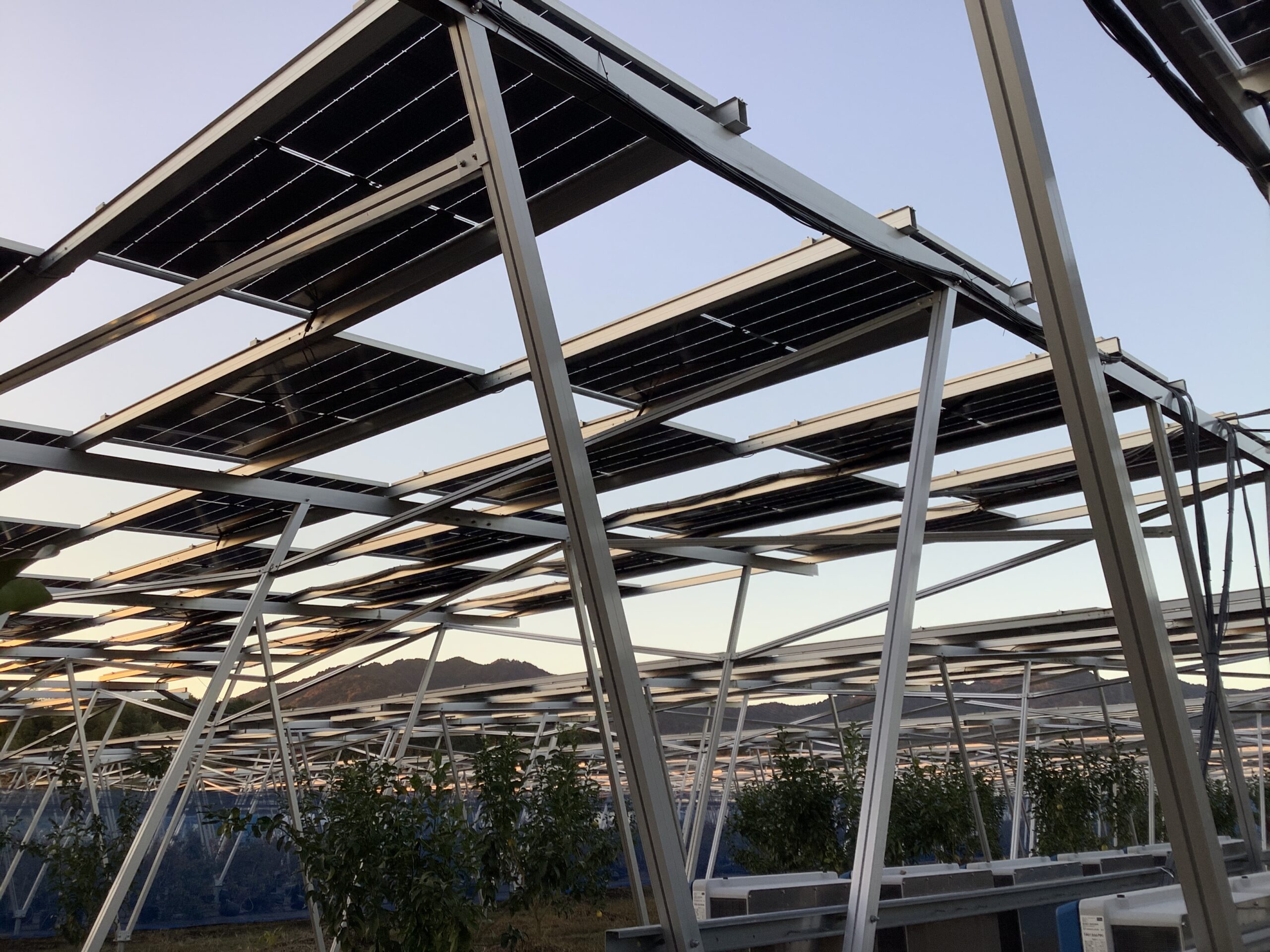 太陽光発電を屋根に使い、遮光率30%で夏の陽射し避けと風雨除けを実施している農家さんを訪問。